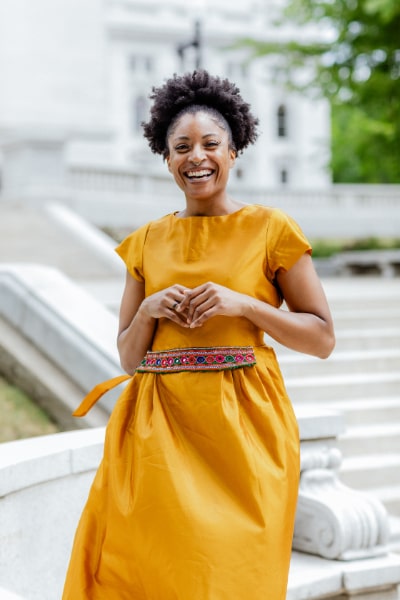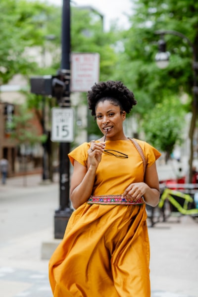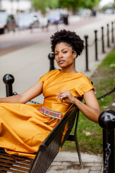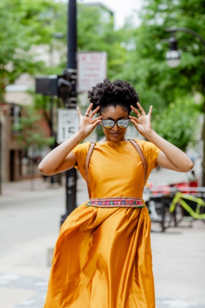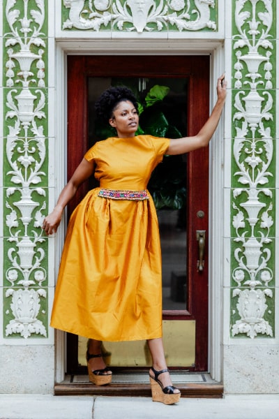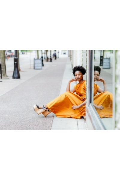 This elegant tea-length dress, crafted from luxurious satin silk in a rich yellow ochre hue, is designed to make a statement. The smooth, flowing fabric drapes beautifully, offering a refined silhouette that flatters every figure. A boho-inspired belt cinches the waist, adding a touch of earthy charm and contrast to the sophisticated sheen of the silk. This dress effortlessly combines timeless elegance with a relaxed, bohemian vibe, making it perfect for a variety of occasions.