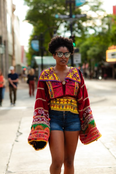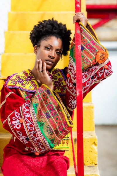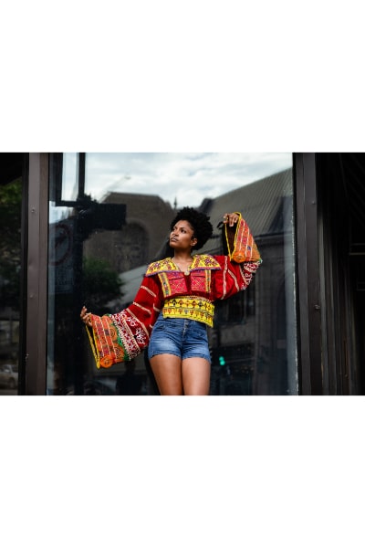 This stunning traditional Afghan top is a masterpiece of craftsmanship, showcasing intricate hand embroidery that celebrates the rich heritage of Afghan tribal motifs. The top is adorned with vibrant scarlet, maroon, and bottle green hues, creating a bold and captivating design. It features a unique, hand-embroidered belt made with beads and vintage embroidered patches, adding depth and cultural authenticity to the piece. The garment is further embellished with coins and beads, enhancing its traditional aesthetic with a touch of shimmer. This top is not just a piece of clothing; it’s a wearable work of art that connects the past with the present.